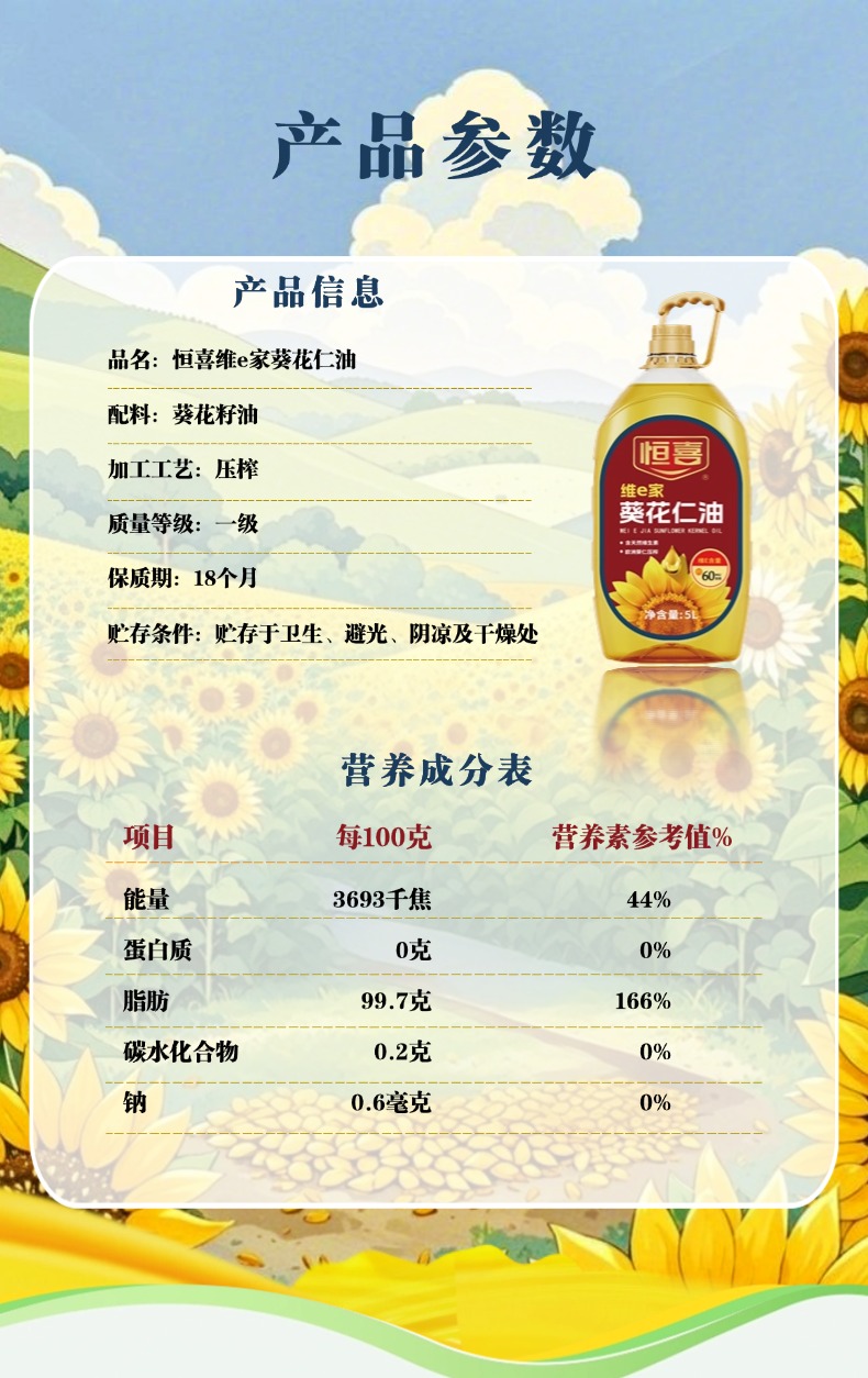 恒喜富含天然维E 欧洲葵仁压榨 5L维e家葵花仁油